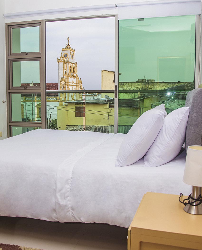 Despertar con vista al centro histórico de Lorica, acondicionada con una cama extra doble, de lencería en algodón, TV por cable, aire acondicionado, escritorio de trabajo, baño dotado con kit de aseo personal. Incluye desayuno para ambos huéspedes.